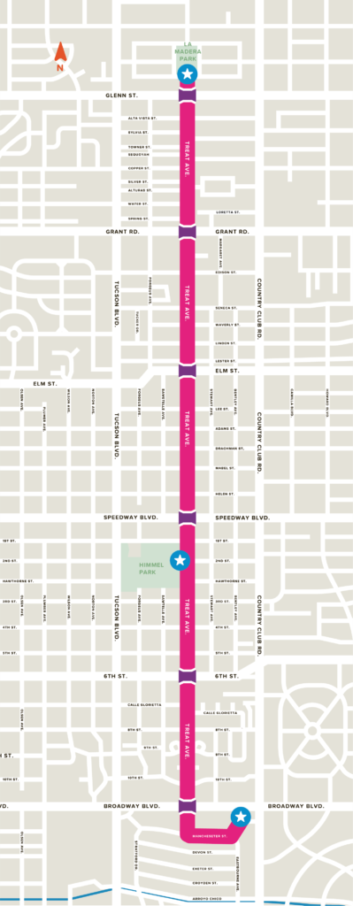 - Routes 1-Glenn, 3-Sixth Street, 4-Speedway, 5-Pima, 8-Broadway, and 9-Grant, all cross the route, while routes 15-Campbell and 17-Country Club run parallel to the event.